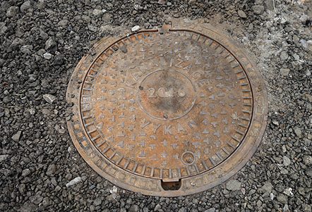 Poklop na kanalizační šachtě s motivem obce Vykáň